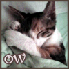 Description: A kitten curled up, one paw half over its face; text: ow