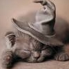 Description: Sleepy kitten with a wizard hat on