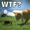 Description: A kitten staring in bafflement at a very large bug. text: wtf?