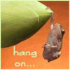 Description: A teeny tiny frog hanging on by one teeny tiny hand; text: hang on...